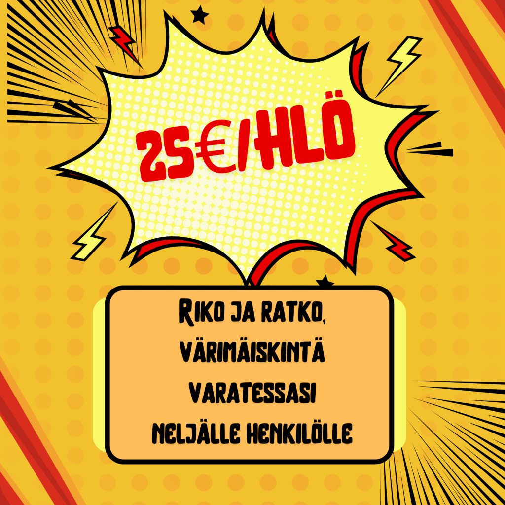 Värimäiskintä 25€/hlö mikäli varaat neljälle henkilölle! Laita s-postia osoitteeseen myynti@raivoomo.fi varatakseen hintaan 25€/hlö.